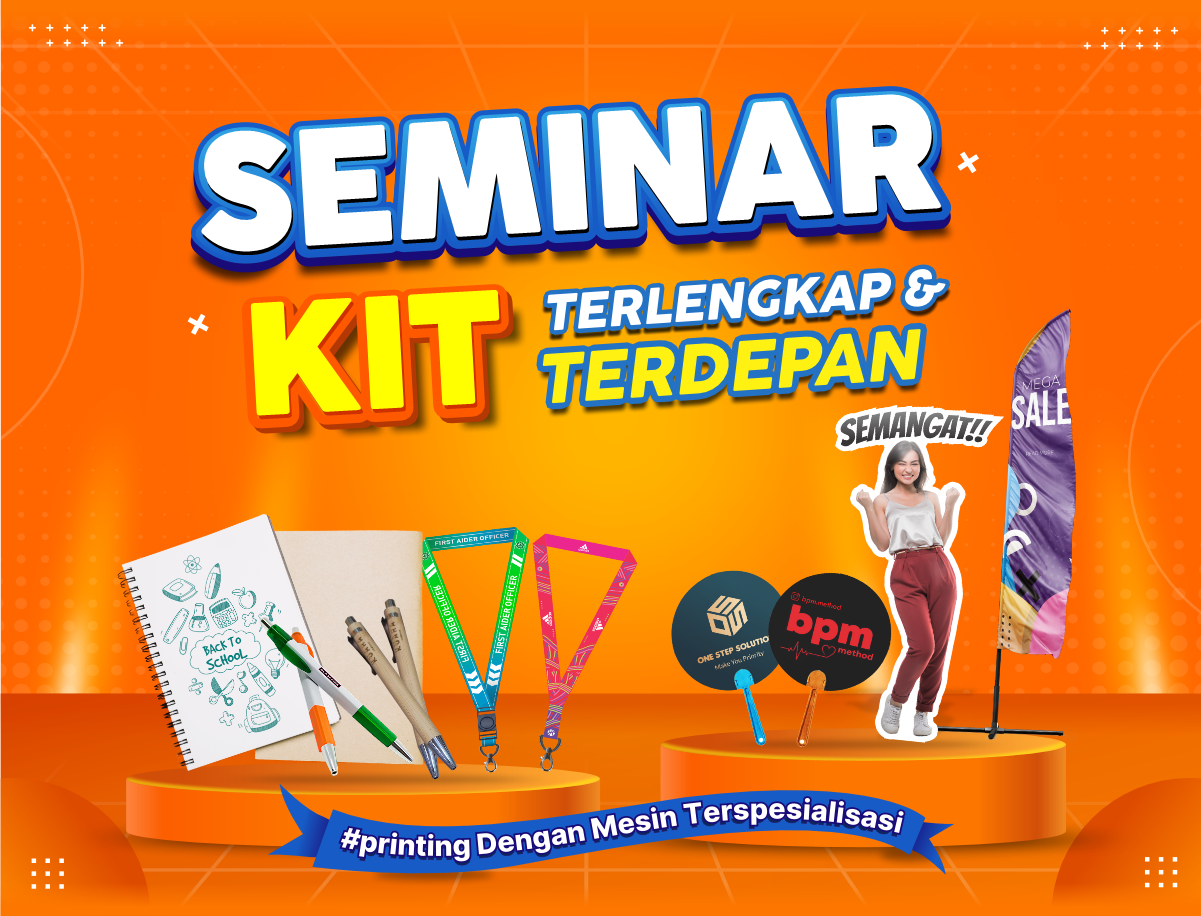 Tas Spundbond, Tas Canvas/Baby Canvas, Plakat Akrilik, Lanyard, ID Card, Tiket Gelang, serta perlengkapan paket seminar lainnya.
